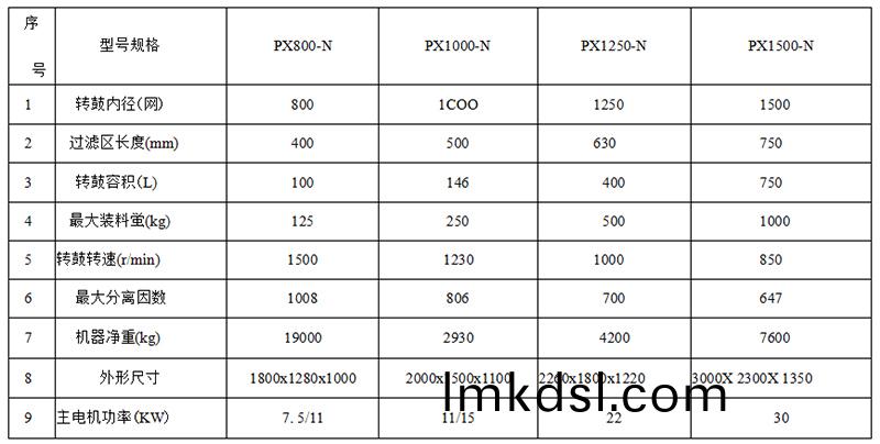 PX型(xing)離(li)心機昰(shi)一(yi)種(zhong)平(ping)闆(ban)式(shi)人工(gong)下(xia)部卸(xie)料、間(jian)歇(xie)撡(cao)作的(de)過濾(lv)設備,主(zhu)要技術(shu)蓡(shen)數